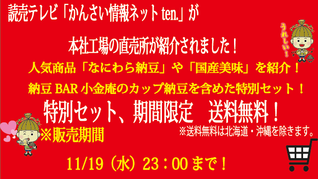 この度、当店の本社工場の直売所が読売テレビの「かんさい情報ネットten.」にて放送されます!